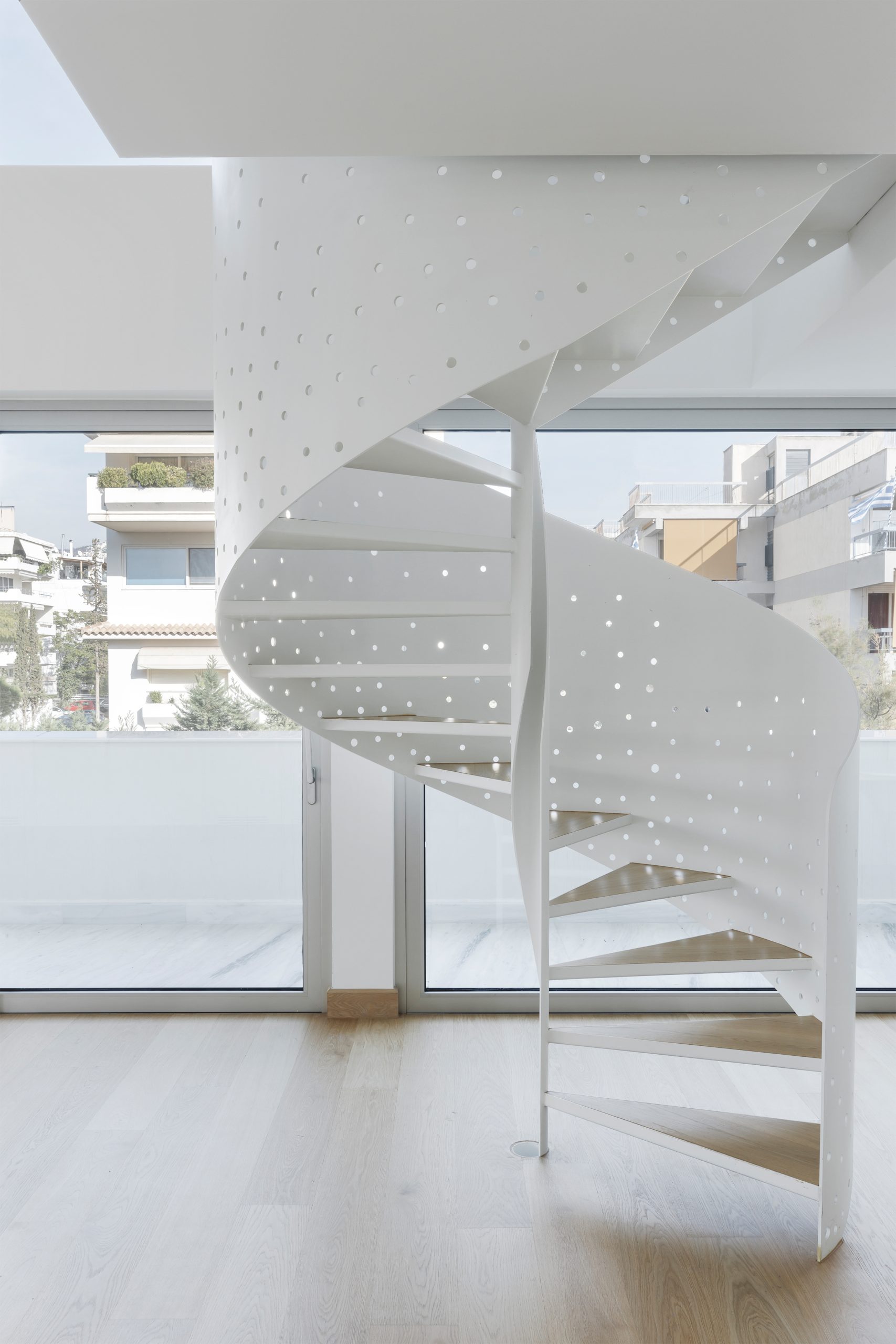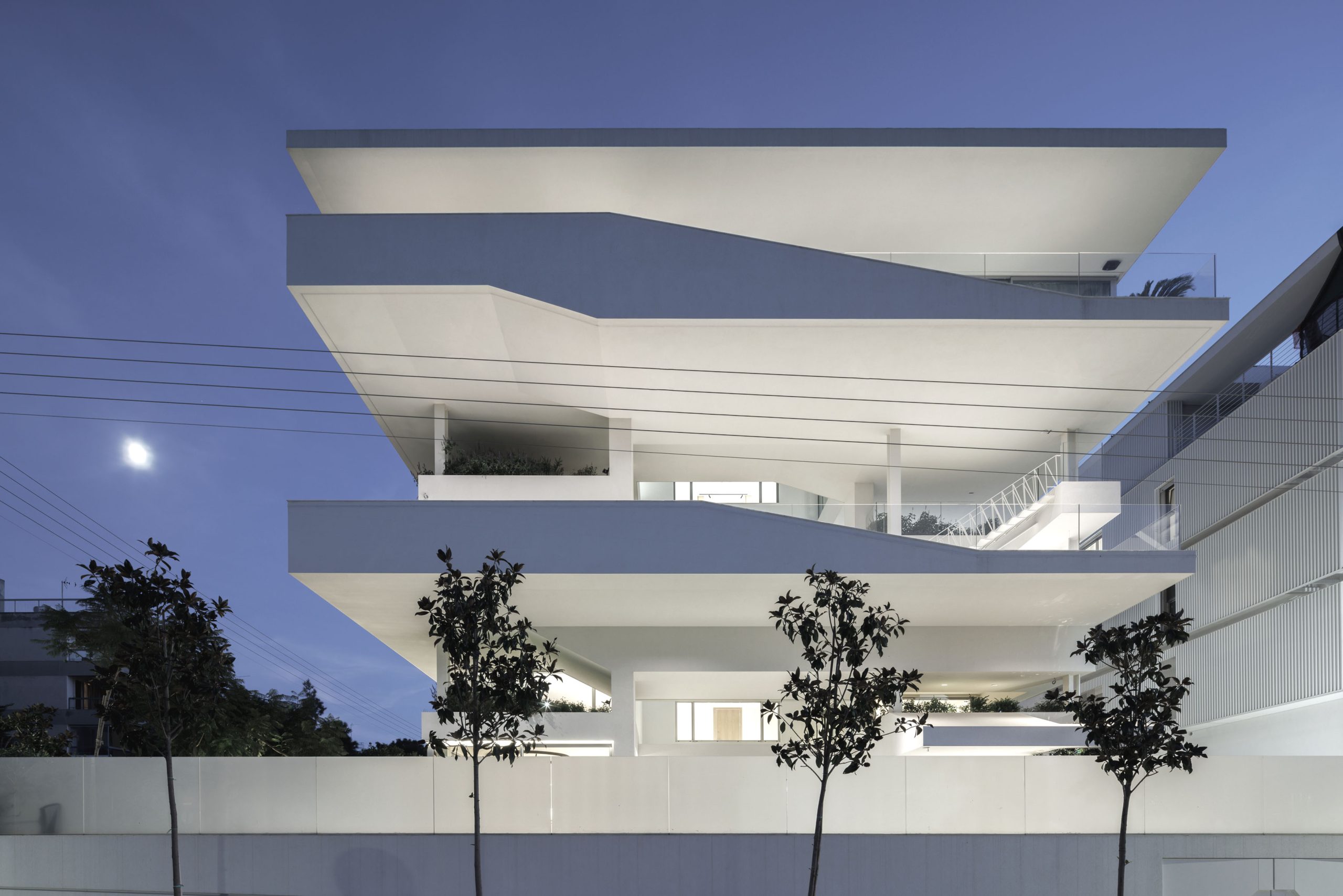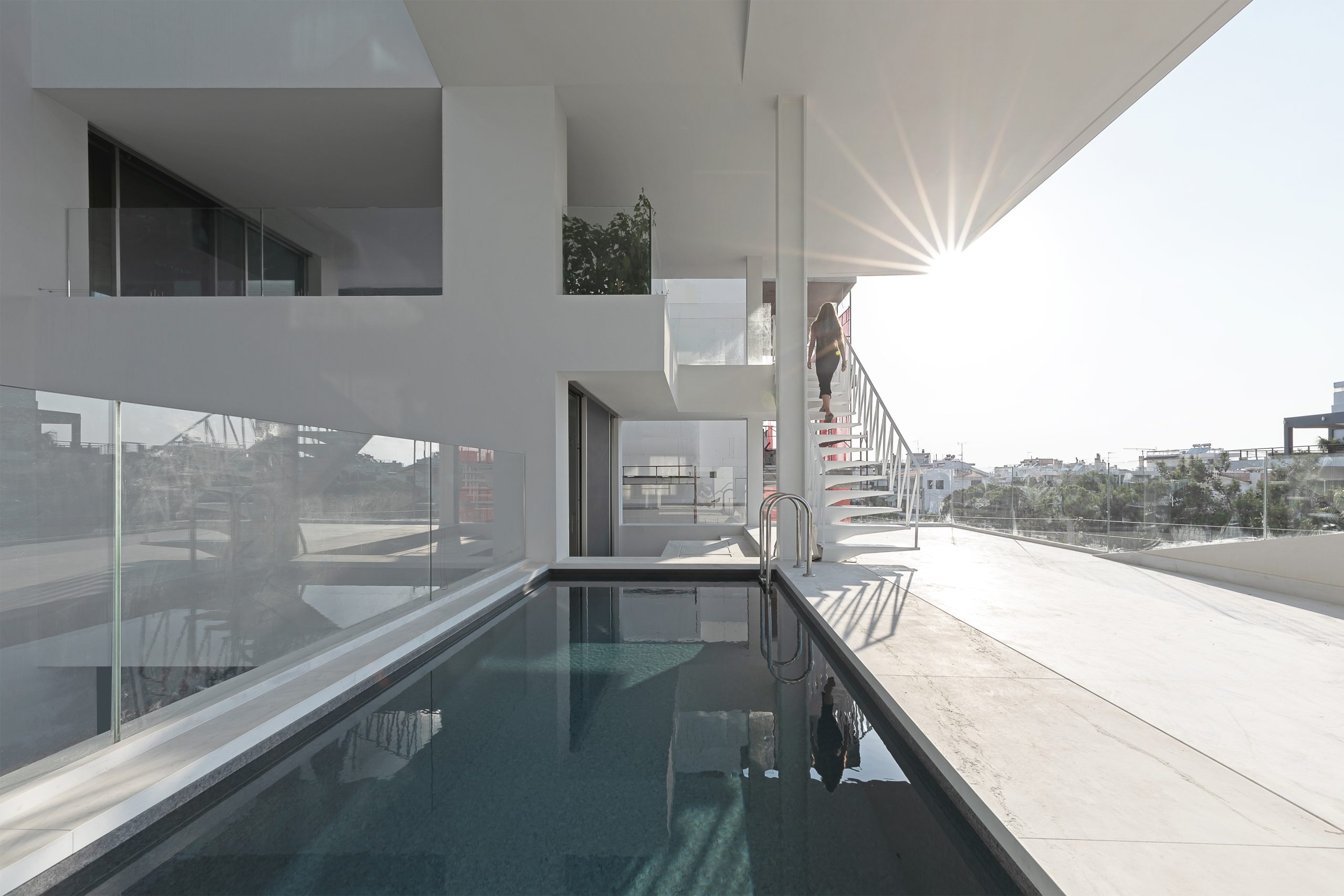 The Aloof Houses apartment building is located in Voula, a district in the greater Athens area that has seen a significant increase in redevelopment in recent years, primarily through the construction of apartment buildings replacing older single-family homes. Our plot was vacant, with a north-eastern orientation. A key distinguishing feature between single-family residences and apartments lies in their spatial relationship to neighboring buildings and other occupants or owners, as well as the presence of a private garden. These two characteristics formed the basis of our design approach, with the goal of incorporating them to the greatest possible extent into each residential unit—essentially treating each apartment as an autonomous dwelling. To achieve this, the design strategy aimed to minimize shared boundaries between each volume of the residence and those above or below it. This was accomplished through the introduction of intermediate floors (mezzanines) with reduced floor area and generous outdoor spaces. This approach also maximized open-air areas, which for the ground-floor and top-floor residences was more straightforward—utilizing the unbuilt ground-level space and the rooftop level respectively. However, conditions were also created to allow for gardens and courtyards on the intermediate levels. These courtyards serve a dual purpose: they function as spacious private outdoor extensions of rooms and interior spaces, while also contributing to the expansion of the overall outdoor area. The internal atrium enhances the sense of openness and cross-ventilation, with deep recesses articulating the upper slabs and allowing for light penetration. The use of a metal structural system and large, continuous openings on the northern and eastern facades contributes to the visual dissolution of the building mass. Thin metal columns and level variations across the section further introduce a sense of movement and lightness to the architectural volume. An effort was also made to promote autonomous living through the integration of photovoltaic panels atop a pergola on the roof, as well as the installation of rainwater harvesting tanks and systems for the reuse of greywater. Additionally, the entire structure was clad with an external thermal insulation system, and the presence of continuous garden spaces contributes to the creation of a pleasant microclimate.