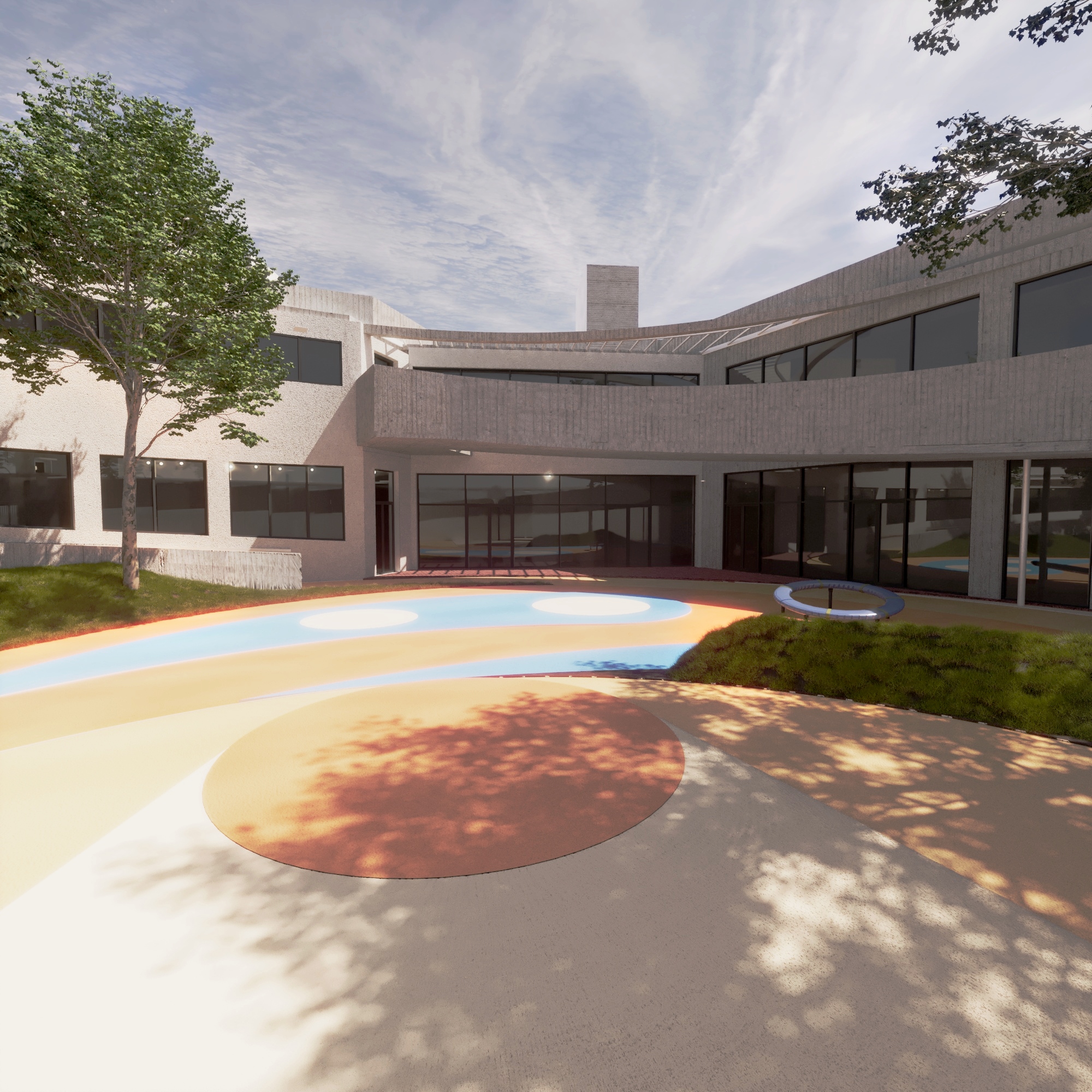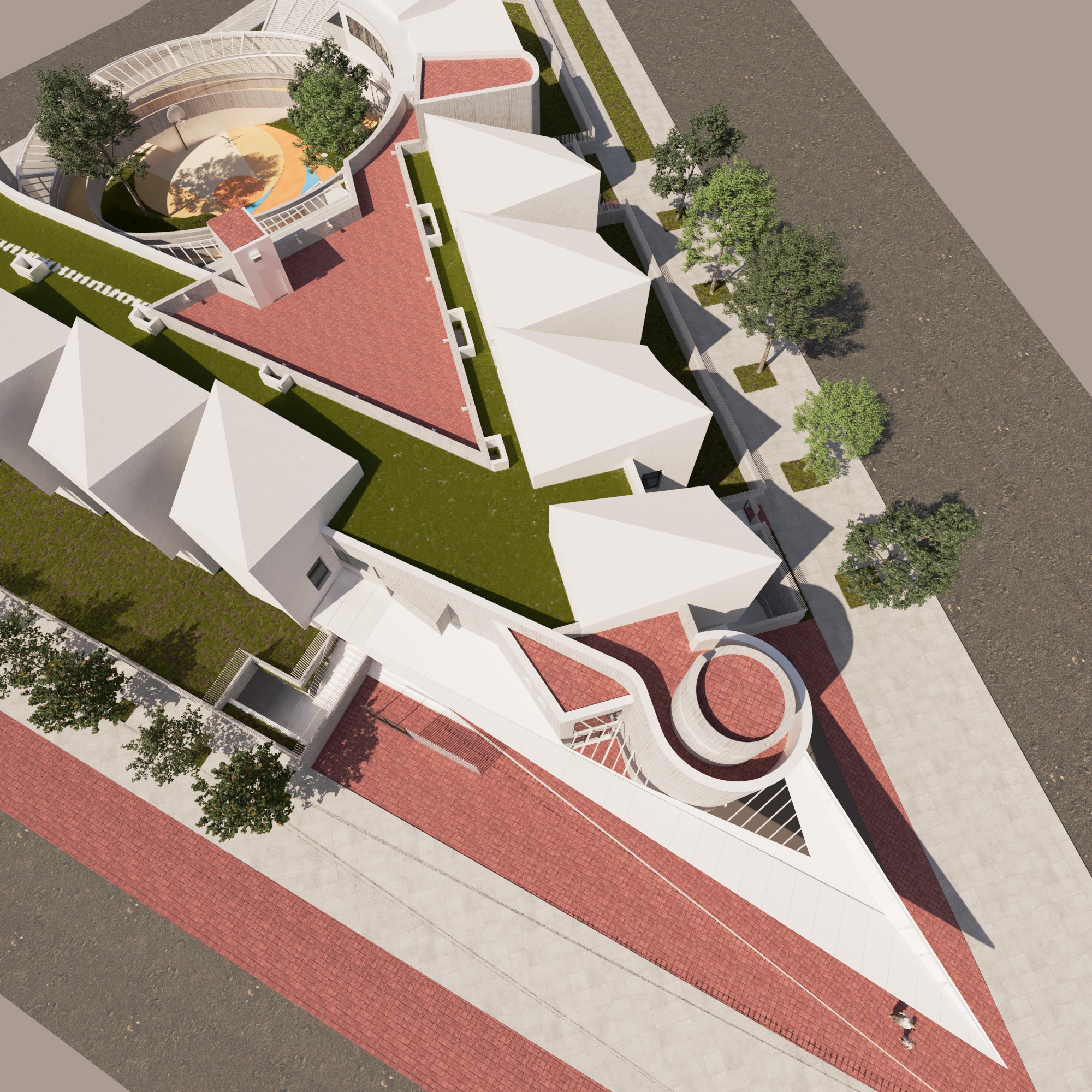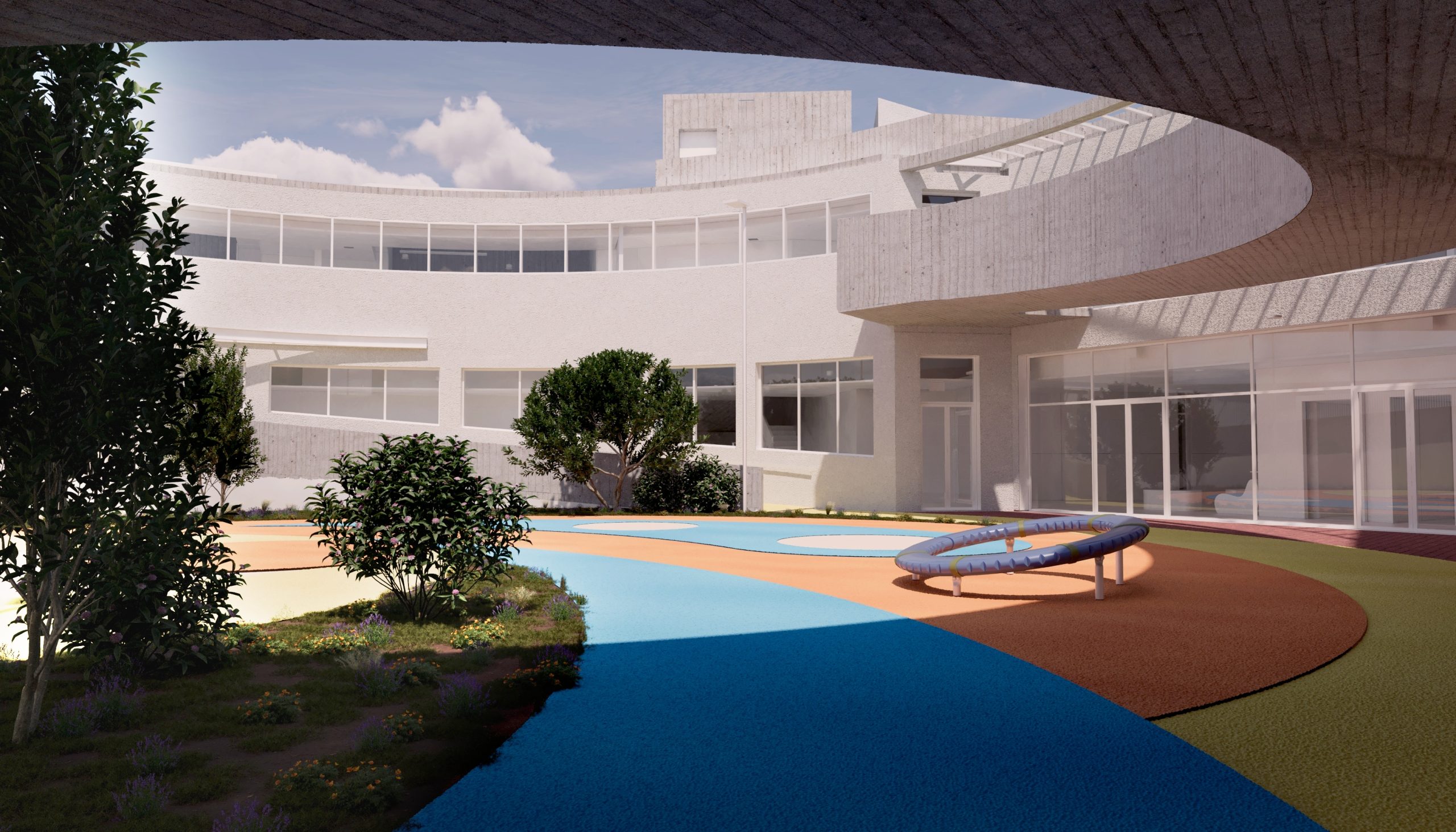 School architecture is one of the key elements that influence children education. Unfortunately, in Greece, public education is mostly housed in impersonal buildings. We want this building to reverse this image and create the conditions for both students and their teachers to find an inspiring environment. The design of a special school is extremely complex. You need to have answers and make decisions on issues that the international research and even international experience in similar schools is incomplete and often contradictory. We want the school to feel like part of the neighborhood and its scale to create that feeling without being provocative in its size. Smaller buildings make up a larger volume around a relatively enclosed courtyard plaza. Stairways and the elliptical ramp are emphasized to make movement as clear as possible. The module room is repeated in order to achieve flexibility of space and possible adaptation to future requirements. But the school was mainly designed to meet the special requirements of its users and the possibility that when the conditions in our society mature, we will see a mixed school where children from the neighbourhood and children from this school will coexist in the same classrooms. In the basement, a public auditorium creates the conditions for the whole local community to use the building during the hours when it is not used as a special school.