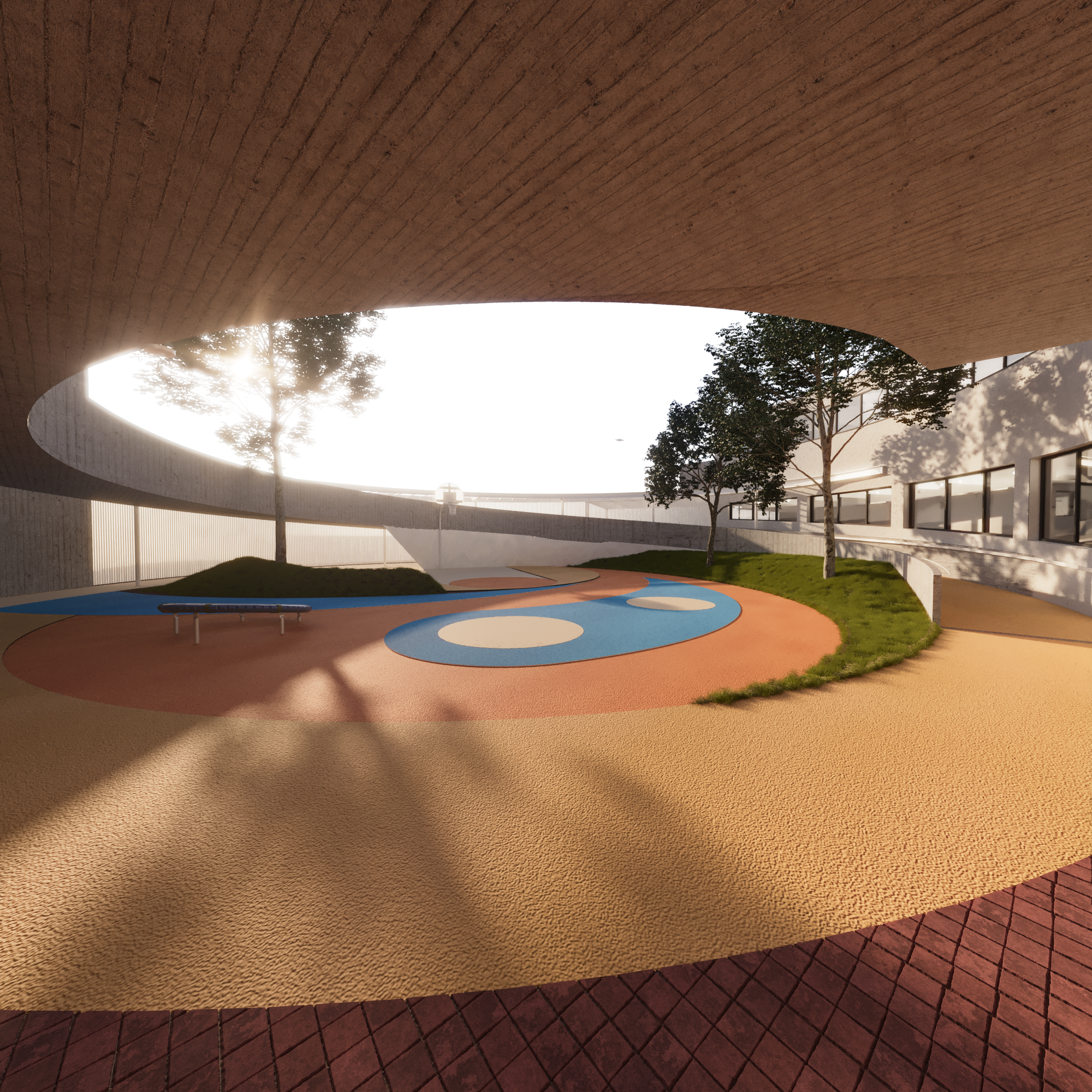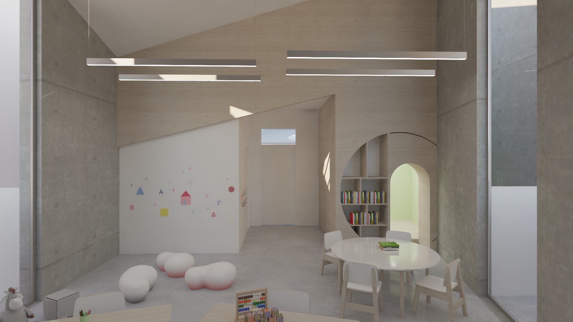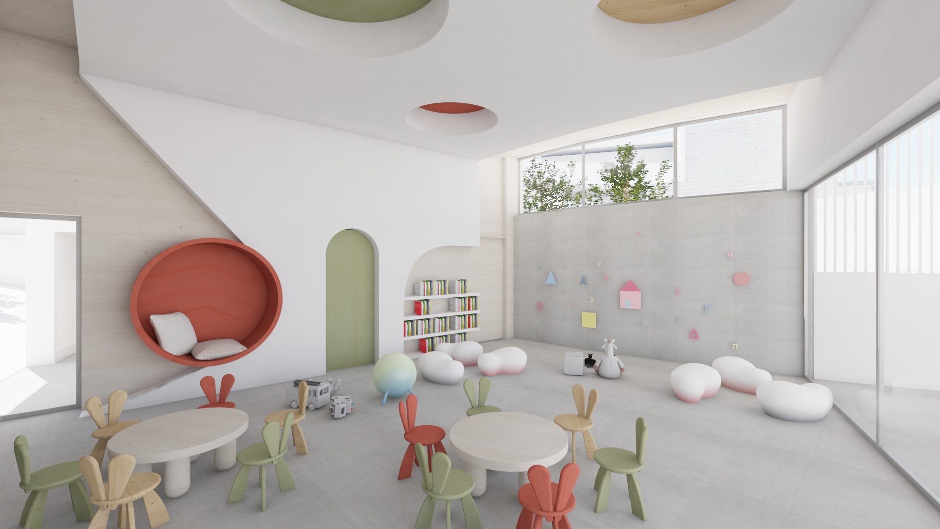 School architecture is one of the key elements that influence children education. Unfortunately, in Greece, public education is mostly housed in impersonal buildings. We want this building to reverse this image and create the conditions for both students and their teachers to find an inspiring environment. The design of a special school is extremely complex. You need to have answers and make decisions on issues that the international research and even international experience in similar schools is incomplete and often contradictory. We want the school to feel like part of the neighborhood and its scale to create that feeling without being provocative in its size. Smaller buildings make up a larger volume around a relatively enclosed courtyard plaza. Stairways and the elliptical ramp are emphasized to make movement as clear as possible. The module room is repeated in order to achieve flexibility of space and possible adaptation to future requirements. But the school was mainly designed to meet the special requirements of its users and the possibility that when the conditions in our society mature, we will see a mixed school where children from the neighbourhood and children from this school will coexist in the same classrooms. In the basement, a public auditorium creates the conditions for the whole local community to use the building during the hours when it is not used as a special school.
