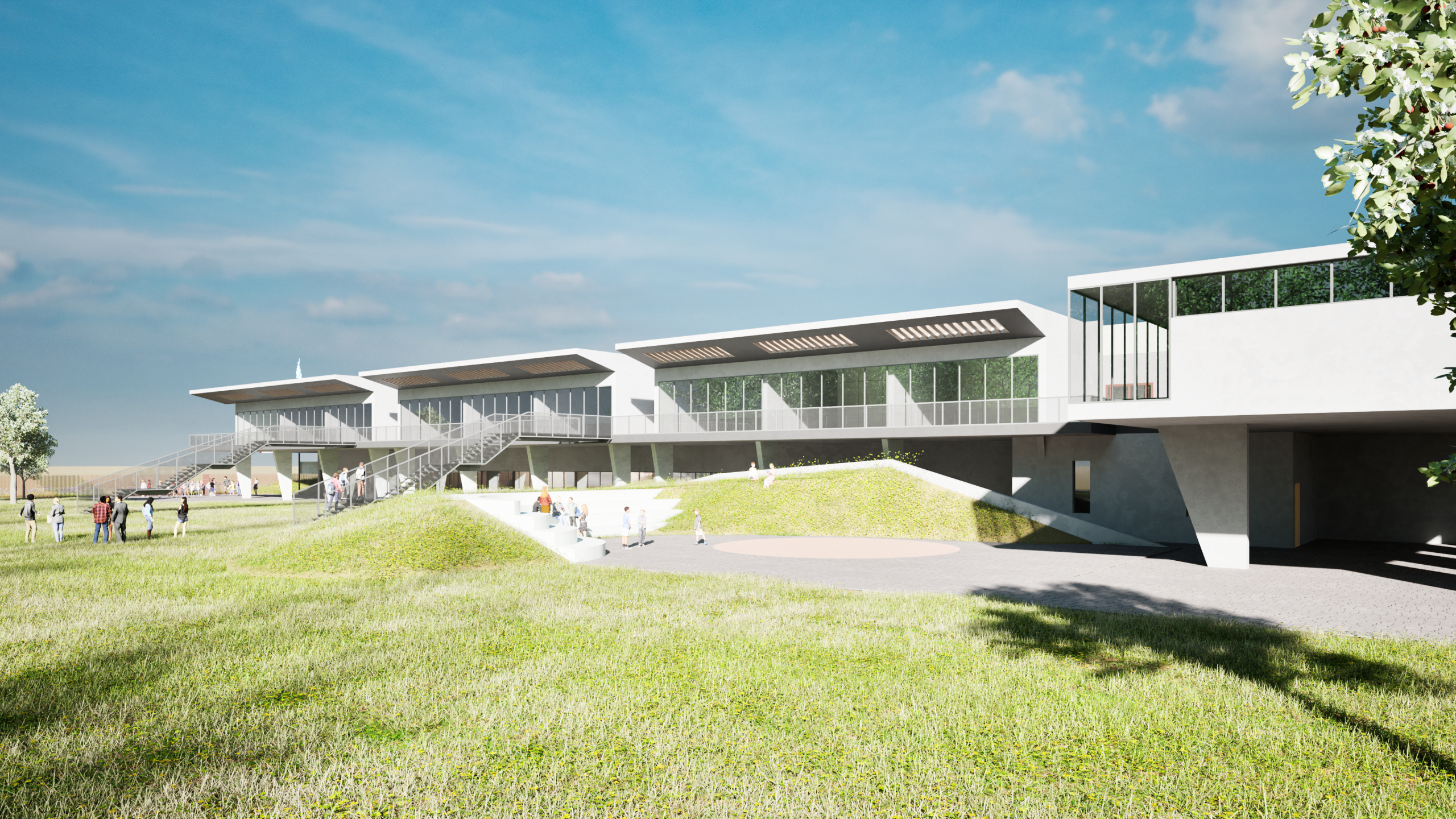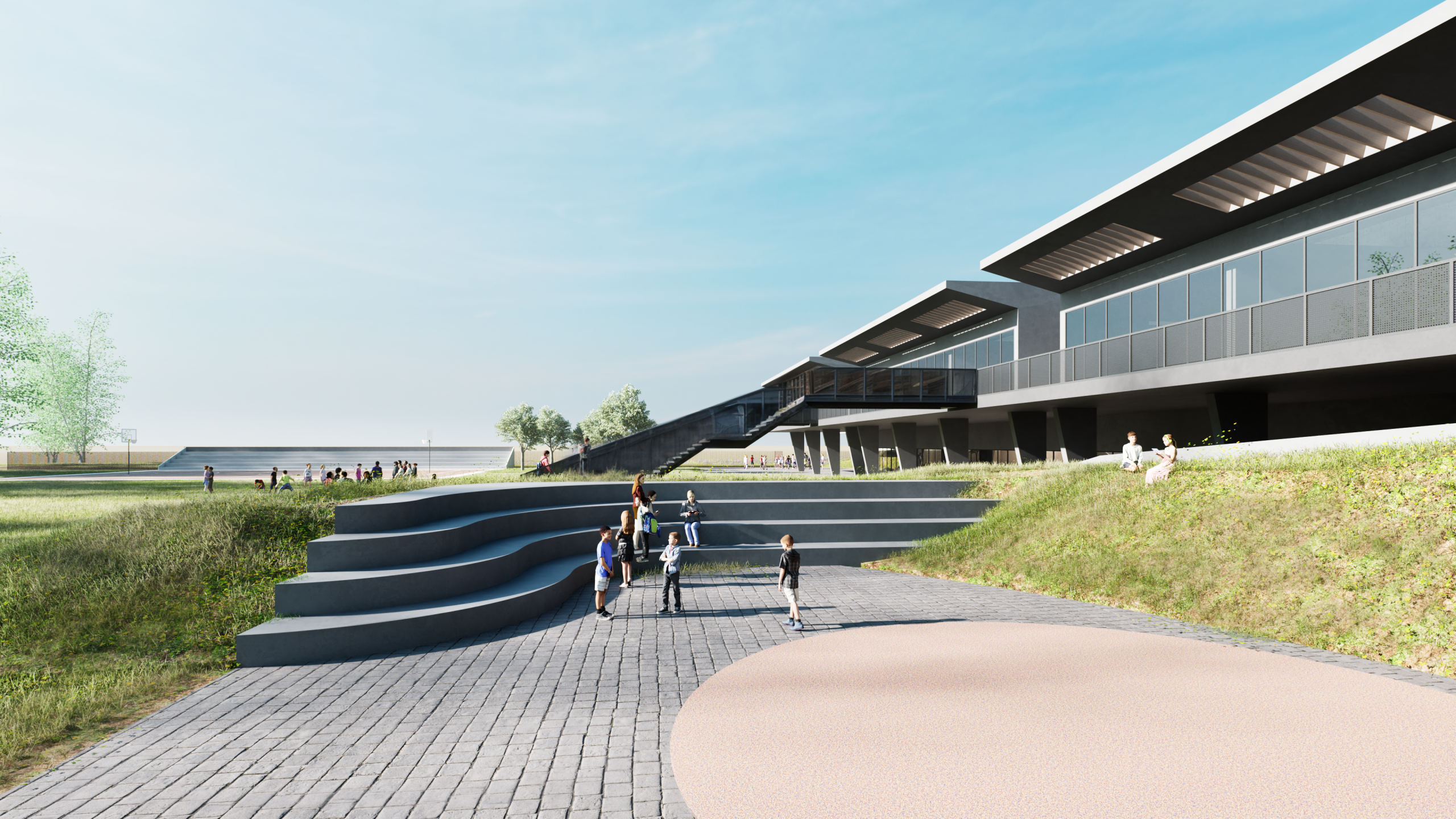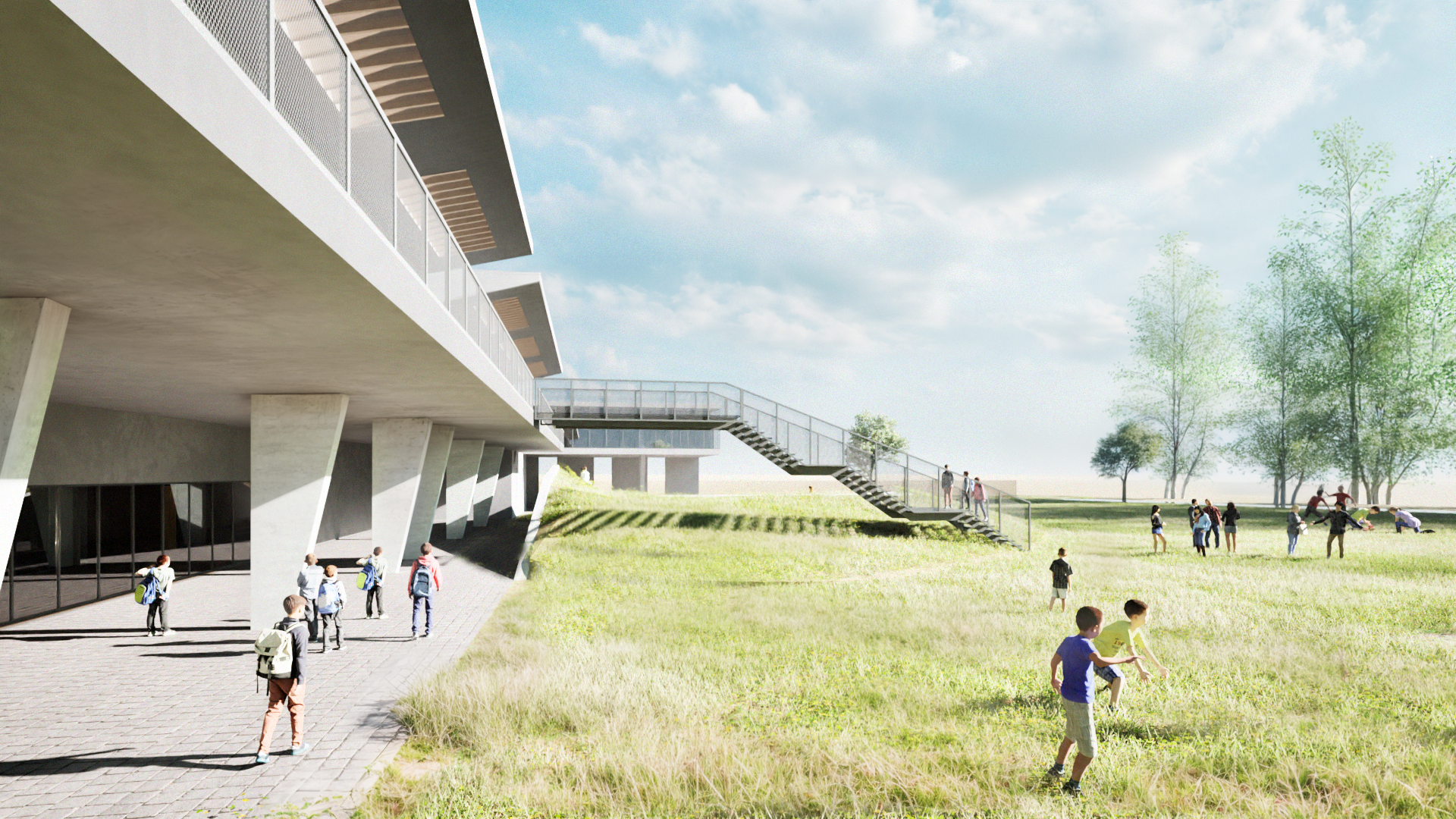 Following the spatial planning program of the Ministry of Education, we have distributed the spaces across the ground floor and the upper floor in such a way that the more public functions of the school are located on the ground floor, while those related exclusively to learning are on the upper floor. The school extends along the East-West axis so that most spaces benefit from a southern orientation. The spaces with southern exposure are mainly the classrooms on the upper floor, while on the ground floor, the main student circulation corridor is located. Students will enter the school from Papanikolaou Street, which is a low-traffic road, and in front of the interior student corridor, there is a covered walkway (arcade) that leads to an expanded area in front of the staircase. This area can serve as a foyer for the multipurpose hall, an exhibition space for the school, or primarily as a breakout area for days with very bad weather. The same area also connects with the library space, which we envision as an open and unified area, as well as the canteen, in order to avoid overcrowding during breaks. Although the corridors are long, they are naturally lit along their entire length, offering visual escapes to the surrounding environment. There are also resting areas and a spacious area in front of the staircase.