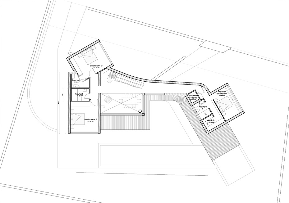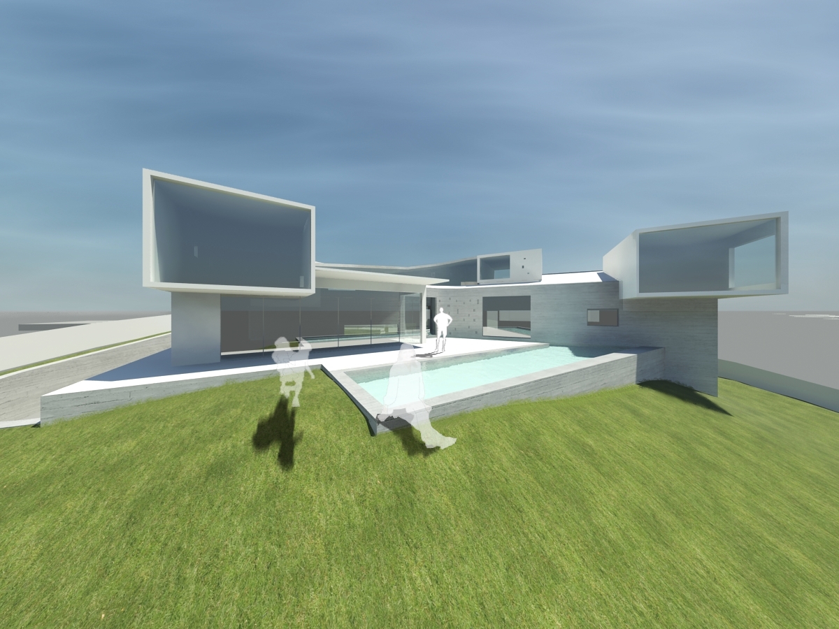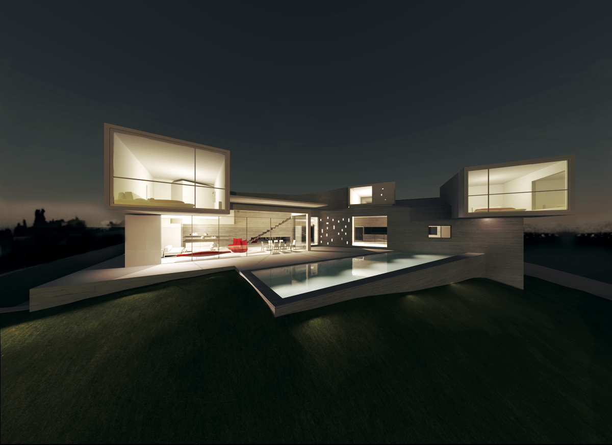 Στο σχεδιασμό αυτής της κατοικίας πλαισιώνονται συγκεκριμένες οπτικές φυγές μέσα σε προβαλλόμενους κύβους. Οι κύβοι ενσωματώνονται στο κύριο σώμα του σπιτιού το οποίο καμπυλώνει παράλληλα με την τοπογραφία του οικοπέδου, δημιουργώντας ένα περίβλημα προς το Νότο και ένα προστατευτικό όριο προς το Βορρά. Ο σχεδιασμός αντλεί έμπνευση από την Ελληνική μοναστηριακή αρχιτεκτονική και χρησιμοποιεί αντιθετικές μορφές και όγκους για να καταλήξει σε μια δυναμική χειρονομία.