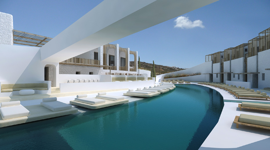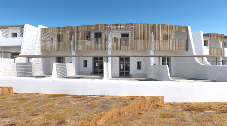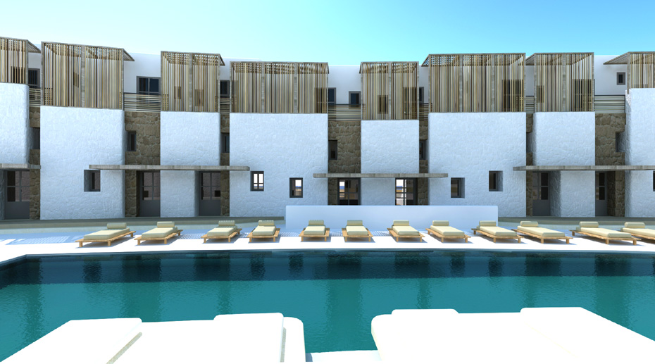 Η μορφολογία των κτιρίων υπακούει στην κεντρική ιδέα του εξωτερικού καμπύλου τοίχου με την εσωτερική αυλή, αλλά και στις λειτουργικές ανάγκες ενός σύγχρονου ξενοδοχείου που τόσο η κοινή ζωή είναι σημαντική, αλλά και η ιδιωτικότητα πρέπει να προστατεύεται. Με γνώμονα πάντα τα στοιχεία που περιγράψαμε της Μυκονιάτικης παραδοσιακής αρχιτεκτονικής έγινε μια προσπάθεια να την ξανασκεφτούμε, μεταερμηνεύοντας στοιχεία της σε σύγχρονη αρχιτεκτονική. Ελπίζουμε να γίνεται εμφανής αυτή η διάθεση διαλόγου με τον τόπο και τον πολιτισμό του, αλλά και η πρόθεση να χτίσουμε για την εποχή μας.