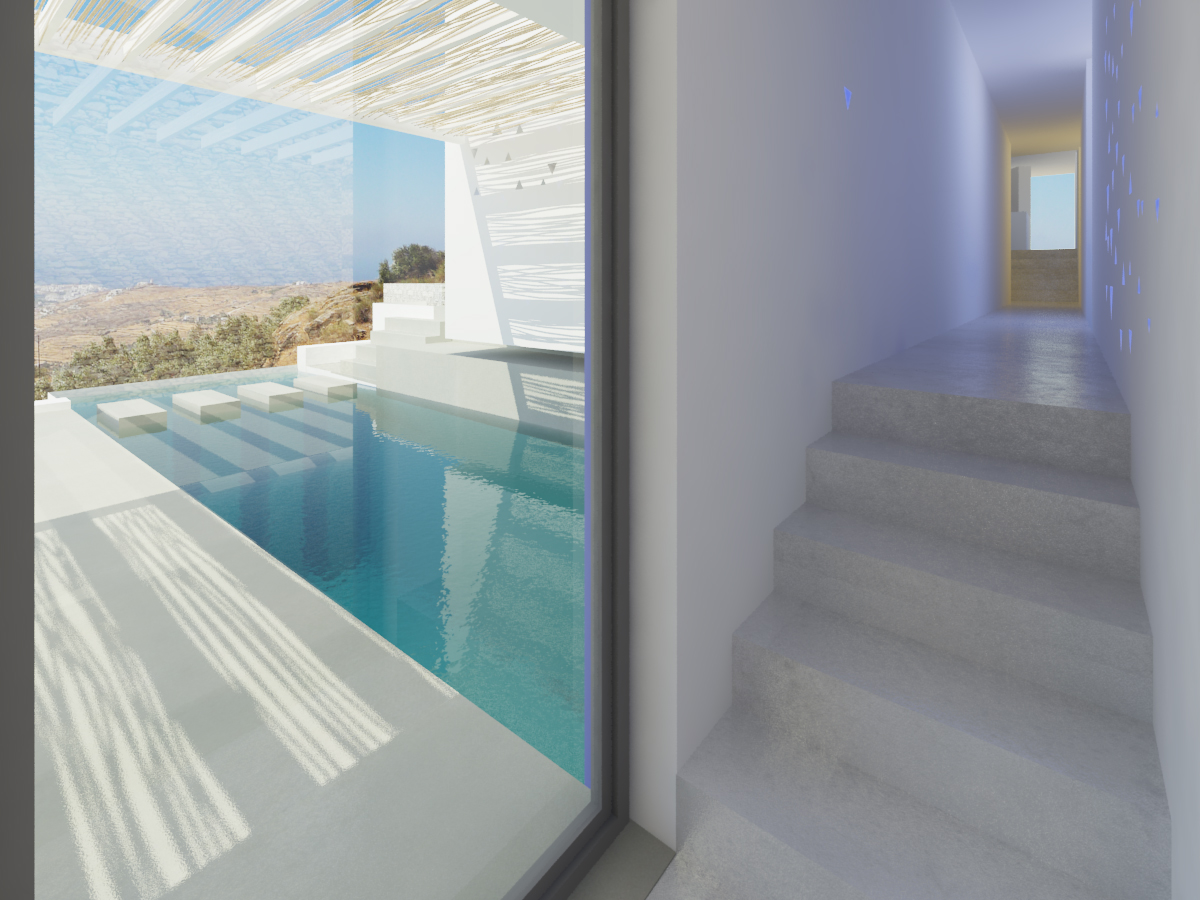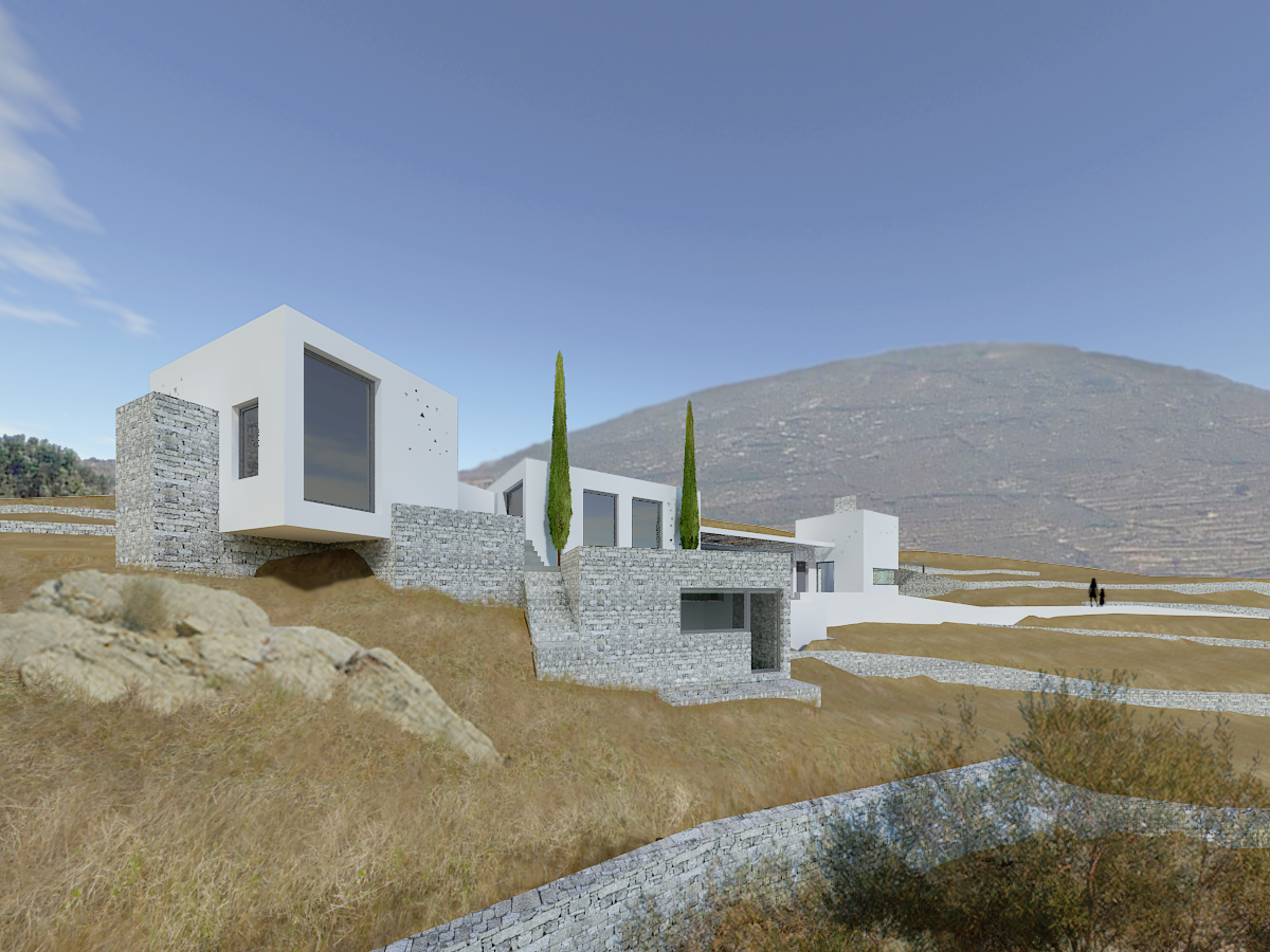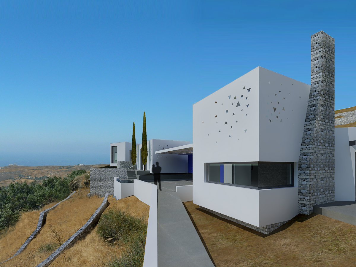 Η εξοχική αυτή κατοικία είναι σχεδιασμένη για μια οικογένεια Γάλλων που αγάπησαν το νήσι της Τήνου και αποφάσισαν να κτίσουν την εξοχική τους κατοικία στο νησί. Η κατοικία έχει σχεδιαστεί με αρχικό concept τη μορφολογική ταυτότητα ενός μικρού τηνιακού χωριού που δημιουργήθηκε αρχικά από μία οικογένεια. Παραλληλεπίπεδα λευκά λειτουργού αυτόνομα και μαζί τοποθετημένα στο Τηνιακό τοπίο με τα πλατώματα από ξηρολιθιές συνεχίζοντάς τη γραμμή τους ή λειτουργλωντας κάθετα προς αυτές. Η ελευθερία αυτής της δομής που συναντάται και στην εξάπλωση ενός χωριού βασίζεται στη μορφολογία του τοπίου στη λειτουργία των χώρων, στις σχέσεις των χώρων μεταξύ τους αλλά και τη θέα προσανατολισμό που επιλέγουν. Μια τέτοια ηθελημένη τυχαιότητα ανδεικνύεται από την ισχυρή παρουσία ενός δρόμου-μονοπατιού διαδρόμου που συνδέει τους χώρους και τους όγκους.