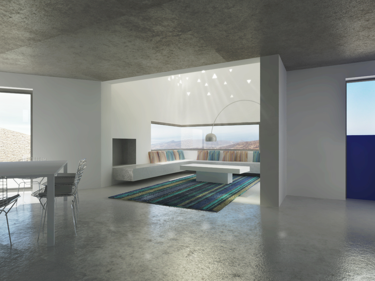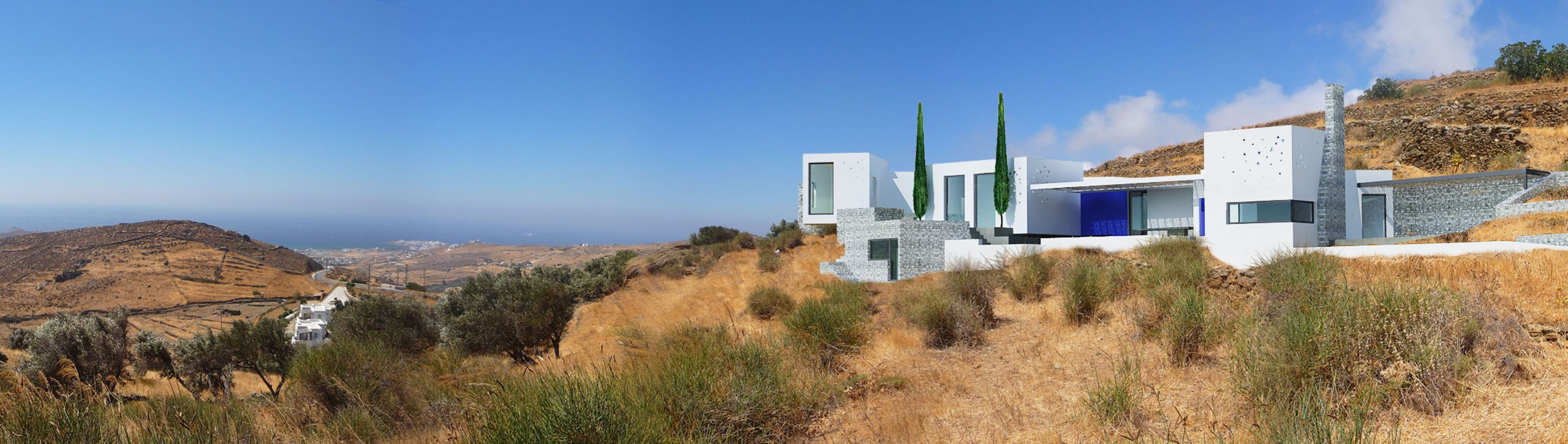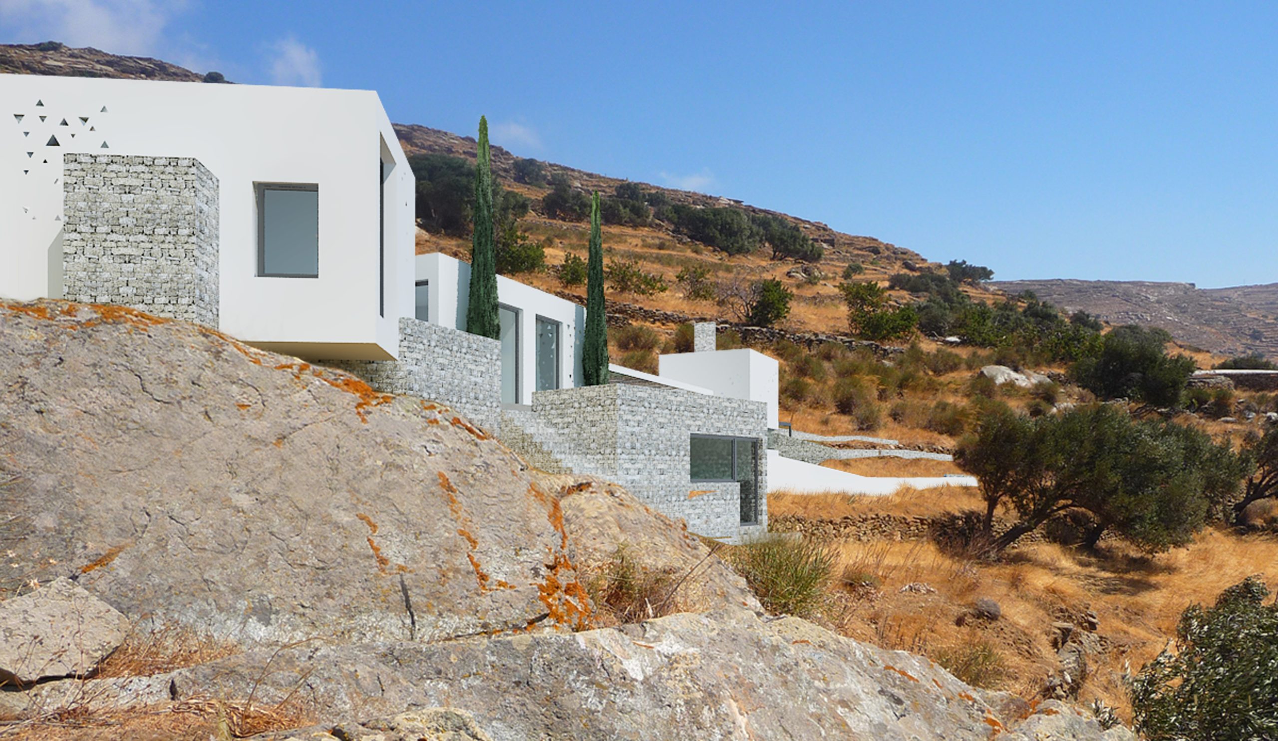 Η εξοχική αυτή κατοικία είναι σχεδιασμένη για μια οικογένεια Γάλλων που αγάπησαν το νήσι της Τήνου και αποφάσισαν να κτίσουν την εξοχική τους κατοικία στο νησί. Η κατοικία έχει σχεδιαστεί με αρχικό concept τη μορφολογική ταυτότητα ενός μικρού τηνιακού χωριού που δημιουργήθηκε αρχικά από μία οικογένεια. Παραλληλεπίπεδα λευκά λειτουργού αυτόνομα και μαζί τοποθετημένα στο Τηνιακό τοπίο με τα πλατώματα από ξηρολιθιές συνεχίζοντάς τη γραμμή τους ή λειτουργλωντας κάθετα προς αυτές. Η ελευθερία αυτής της δομής που συναντάται και στην εξάπλωση ενός χωριού βασίζεται στη μορφολογία του τοπίου στη λειτουργία των χώρων, στις σχέσεις των χώρων μεταξύ τους αλλά και τη θέα προσανατολισμό που επιλέγουν. Μια τέτοια ηθελημένη τυχαιότητα ανδεικνύεται από την ισχυρή παρουσία ενός δρόμου-μονοπατιού διαδρόμου που συνδέει τους χώρους και τους όγκους.