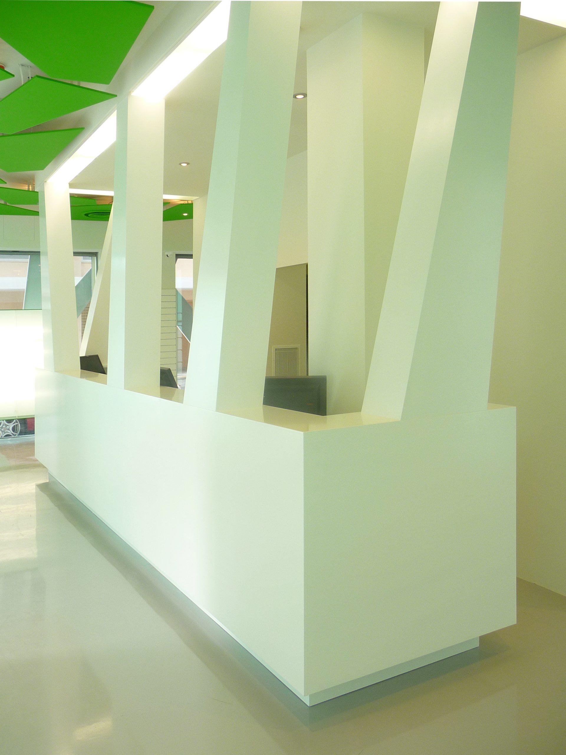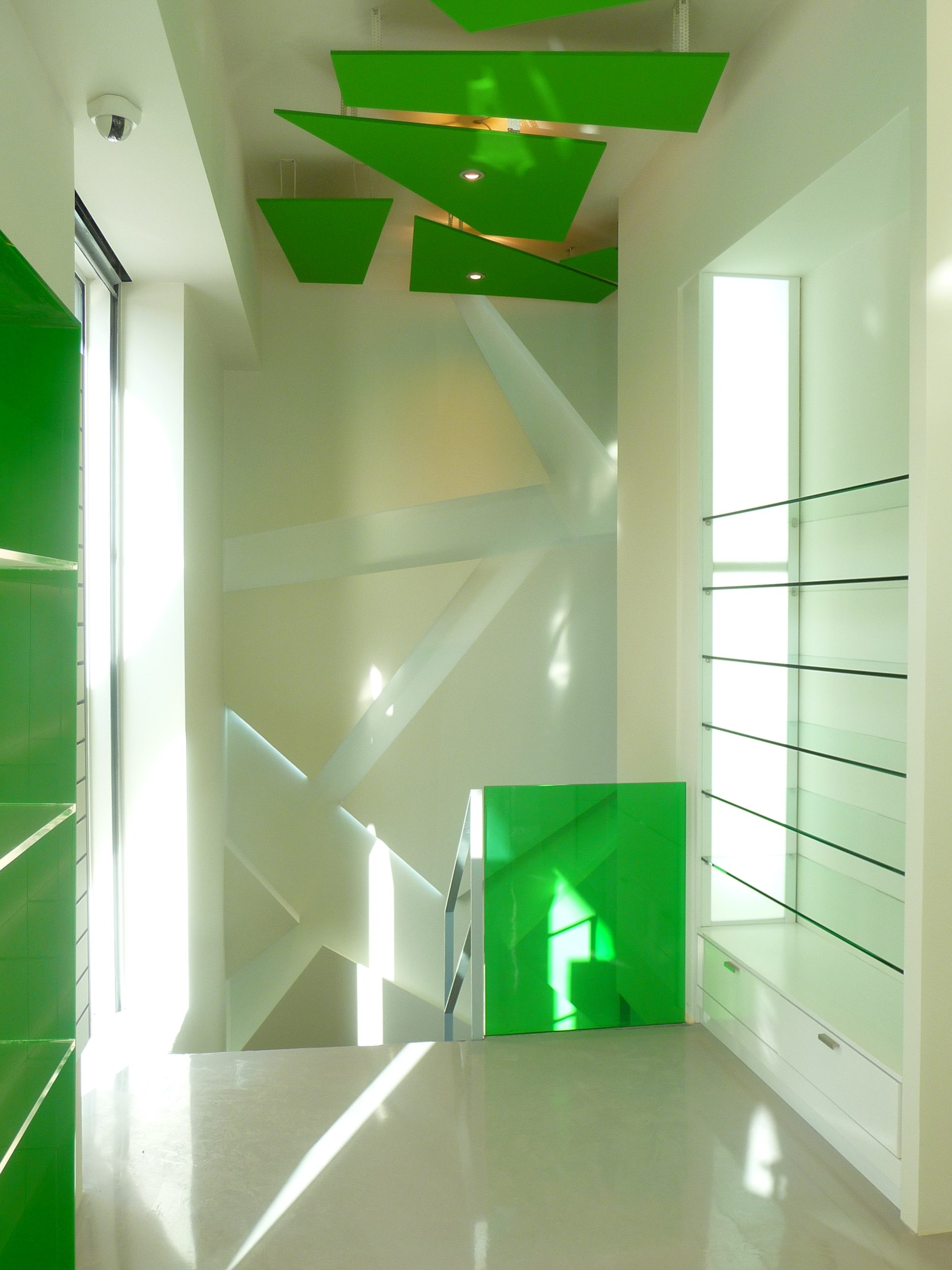 In one of the oldest neighborhoods of Athens close to the new Acropolis museum KLab architects were commissioned to create a new pharmacy-cosmetics store on the ground floor of an apartment building. Our approach was to create a context within the certain context that existed. The scenario of a pharmacy come out of nature contributed to the idea that nature coexists with technology innovation to create pharmaceutical and cosmetic products. As response to that we exposed a tech-nature environment a lab within the nature within the city. Branches as a dislocated shadow phenomenon of the adjacent trees create and protect the façade and the products from the heat and the sun. Like trees holding the old apartment building, disassociate the urban typology to create an eye catching façade. In the interior emphasis was given to the ceiling and to the exposed concrete columns that represent the forest. The reception desk follows the concept and becomes the center of the store. Perspex and white lacquered shelves designed by Klab create a unique display atmosphere. A metallic stair leads to the lower level a lab area where prescriptions are been produced and an office space. Alternatively the area can be used for seminars and larger items display space. The stairs wall is being engraved with plaster and lighting creating plant morphing shapes. Κουκάκι, Αθήνα 300m2 Design: KLab architecture-Κωνσταντίνος Λαμπρινόπουλος Συνεργάτες αρχιτέκτονες: Enrique Ramirez, Κωστής Αναγνωστάκης, Mark Chapman Σε μία από τις παλαιότερες γειτονιές της Αθήνας κοντά στο νέο μουσείο της Ακρόπολης στην οδό Δημητρακοπούλου και Σικελίας στο Κουκάκι ανατέθηκε στους KLab architects να δημιουργήσουν ένα νέο φαρμακείο στο ισόγειο μιας γωνιακής πολυκατοικίας. Έχοντας ήδη σχεδιάσει το placebo pharmacy στη Γλυφάδα ο σχεδιασμός του νέου αυτού φαρμακείου απότελεσε μία ακόμα πρόκληση στην ανατροπή της στερέοτυπης εικόνας ενός συνοικιακού τέτοιου καταστήματος. Η ιδέα ότι το φάρμακο προέρχεται είτε από τη φύση είτε από την επιστημονική έρευνα και τεχνολογία μας περίεγραψε τους συνθετικούς άξονες που κινηθήκαμε στο σχεδιασμό του φαρμακείου αυτού. Το υβρίδιο ενός τεχνολογικού δάσους ή μιας εργαστηριακής φύσης μας αποσχόλησε και από την επεξεργασία της συγκεκριμένης ιδέας δημιουργήθηκε η εικόνα και η ουσία της λειτουργίας του φαρμακείου. Μεταλλικά αφαιρετικά μοτίβα που προσομοιάζουν σε κλαδιά δέντρων «στηρίζουν» την πολυκατοικία. Σαν σκιές από τα γειτονικά δέντρα λειτουργούν ταυτόχρονα σαν δεύτερη επιδερμίδα φιλτράροντας το ηλιακό φως περιορίζοντας το σημαντικά προστατεύοντας τα φαρμακευτικά προϊόντα. Η είσοδος διαμορφώνεται με ένα πρόστεγο βασισμένο στις οργανικές μορφές της όψης ενώ μια μεταλλική κατασκευή ενώνει το επίπεδο του πεζοδρομίου με αυτό του καταστήματος μέσω μίας ράμπας ή μιας μικρής κλίμακας δύο σκαλοπατιών. Στο εσωτερικό ιδιαίτερη προσοχή δόθηκε στην πράσινη οροφή κατασκευασμένη από 3 τύπους ακανόνιστων τετράπλευρων και στις κολώνες από εμφανές σκυρόδεμα, που με επιμέλεια φανέρωσαν την πρωταρχική τους μορφή, που δημιουργικά αναφέρονται σε μια εικόνα δάσους. Το έπιπλο της υποδοχής μετατρέπεται σε χώρο ακολουθώντας στο σχεδιασμό του το κυρίαρχο concept διαμορφώνοντας τον κεντρικό πυρήνα του καταστήματος. Ράφια από πράσινο διάφανο πλέξιγκλας και έπιπλα από λευκή λάκα φωτιζόμενα ,όλα σχεδιασμένα από την KLAB ειδικά για το χώρο αυτό, δημιουργούν απρόβλεπτες επιφάνειες έκθεσης των προϊόντων. Μια μεταλλική σκάλα οδηγεί στο κάτω επίπεδο που υπάρχει το εργαστήριο, το γραφείο, αποθηκευτικός χώρος αλλά και μια αίθουσα για σεμινάρια και πωλήσεις. Ο τοίχος της σκάλας έχει δημιουργηθεί από ανάγλυφες γωτιζόμενες εσωτερικά μορφές στη γυψοσανίδα ακολουθώντας και εδώ οργανικές μορφές δημιουργώντας ιδανικές συνθήκες για τη μετάβαση από το ένα επίπεδο στο άλλο. Το πράσινο ημιδιάφανο γυαλί ξεχωρίζει τους ιδιωτικούς χώρους από τους χώρους που το κοινό έχει πρόσβαση. Τέλος το βιομηχανικό εποξειδικό δ