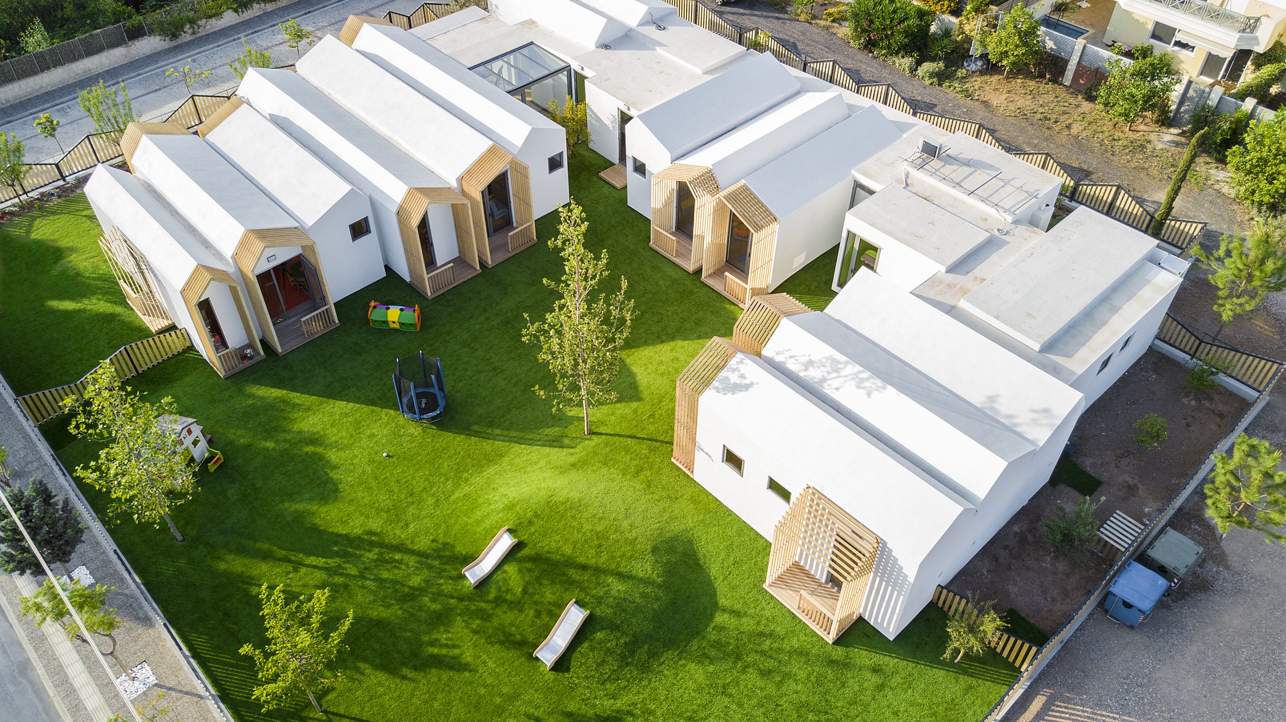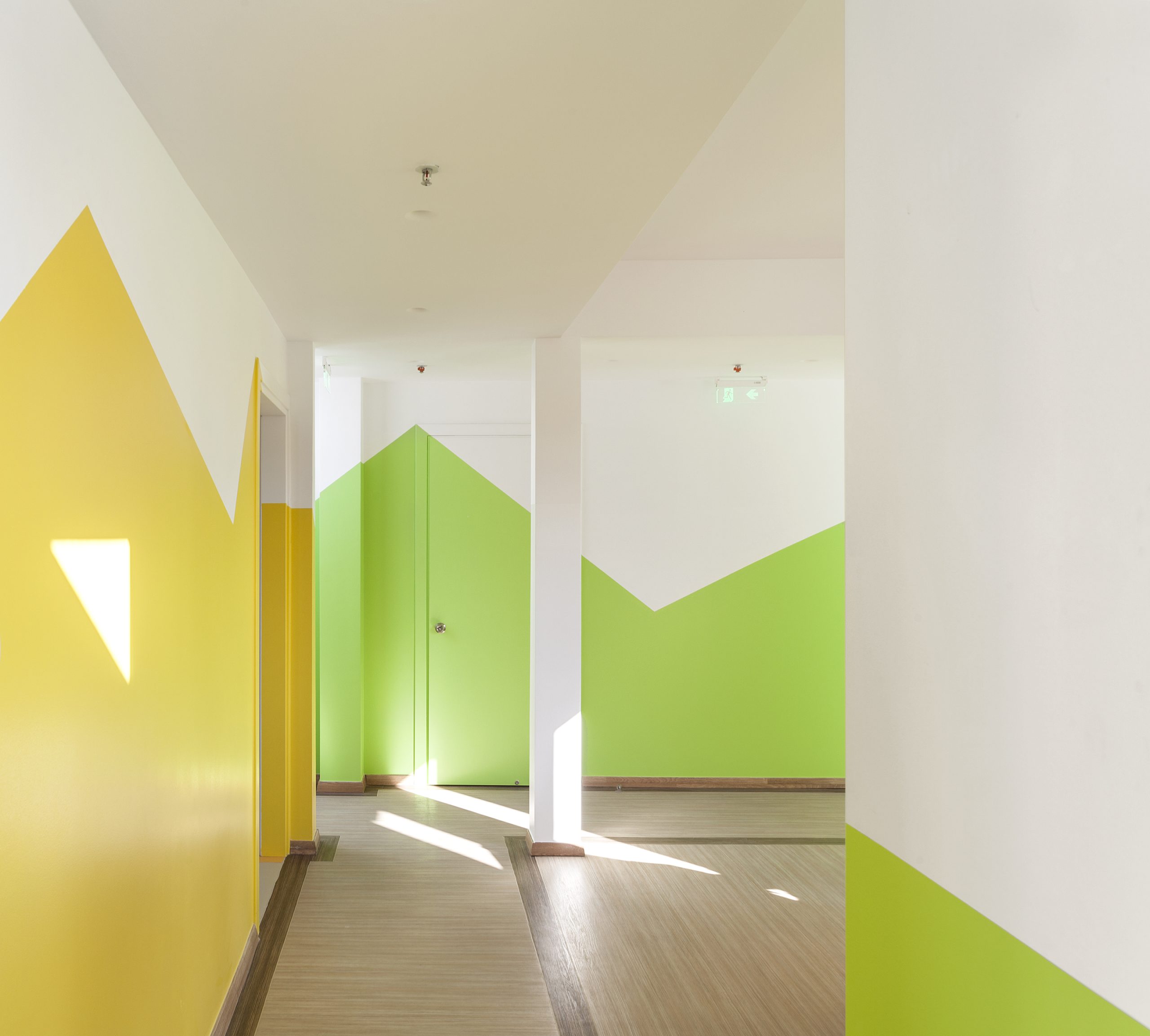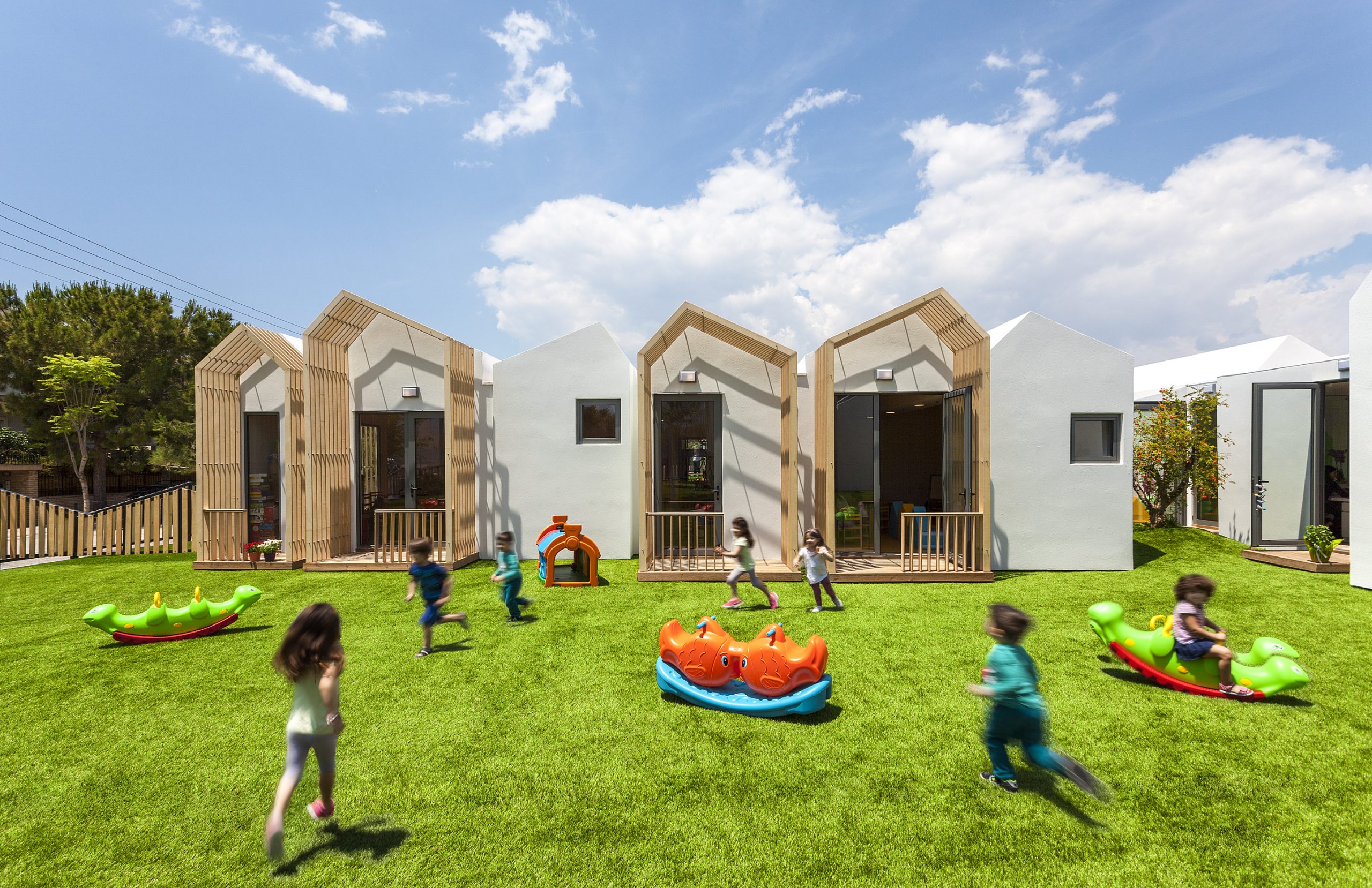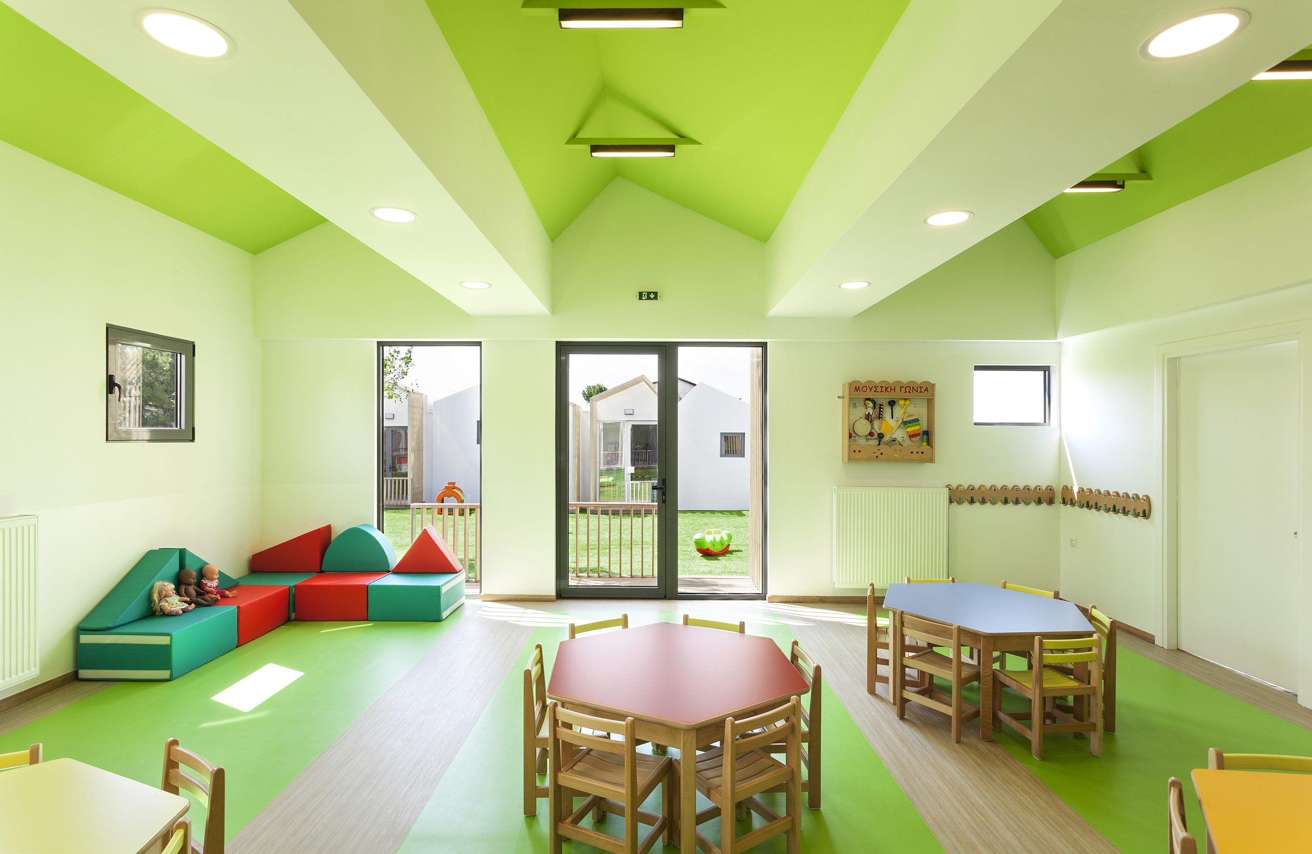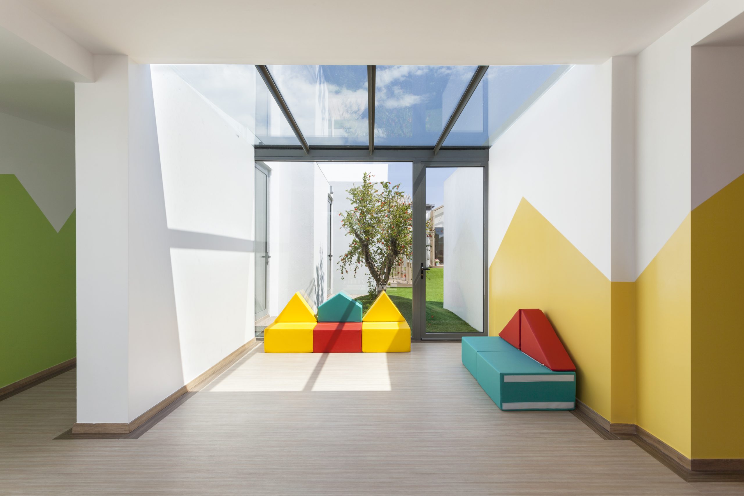 The nursery school was designed so that all the classrooms have three open sides. As a consequence, the arrangement of the classrooms is organized around a central courtyard while also formed by smaller atriums.
