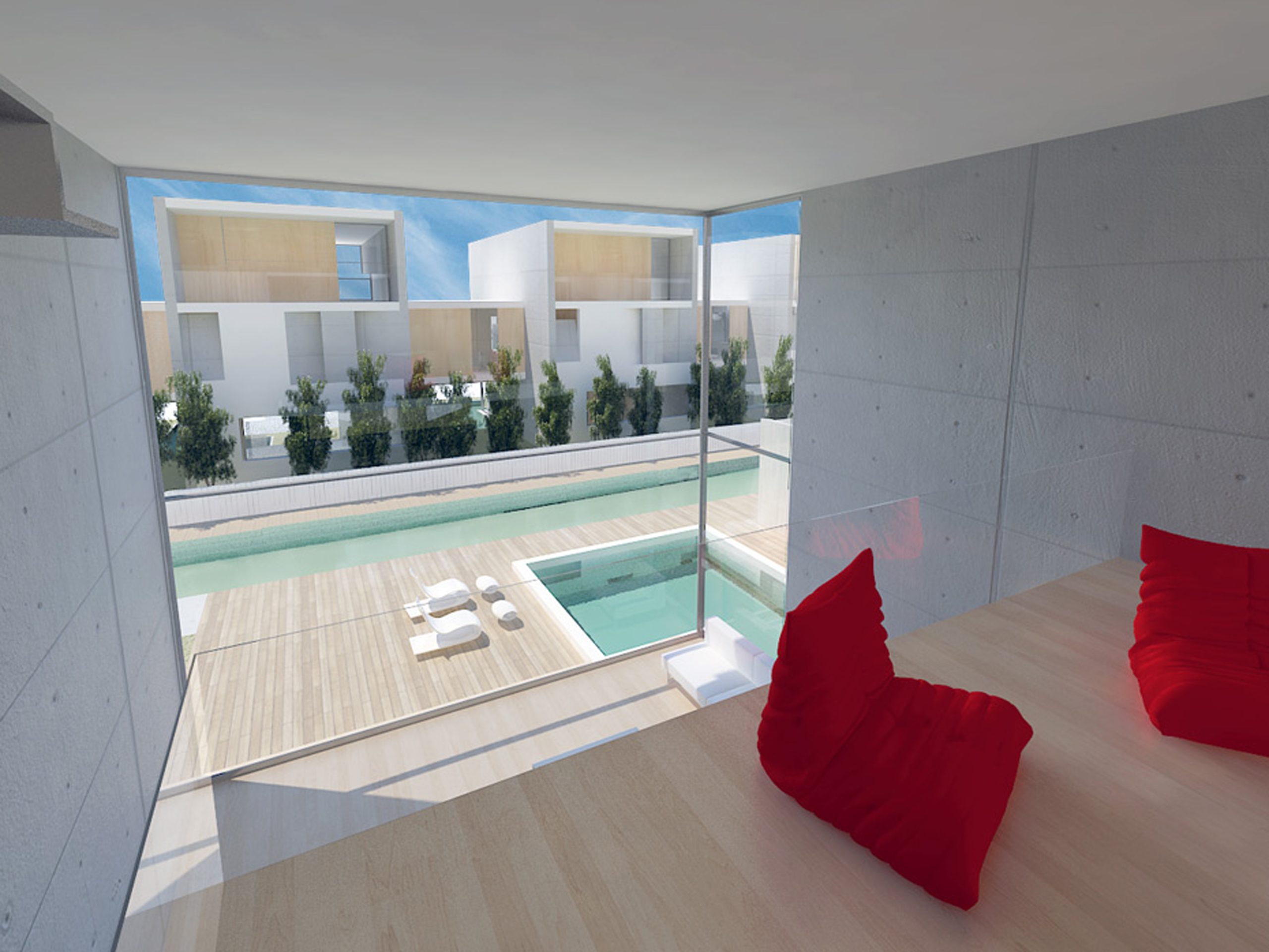 In a separate plot one building is located. Has 7 units with different characteristics and sizes, that while it preserves several elements from the other buildings, it stands out as a transparent, permeable, lit unit.